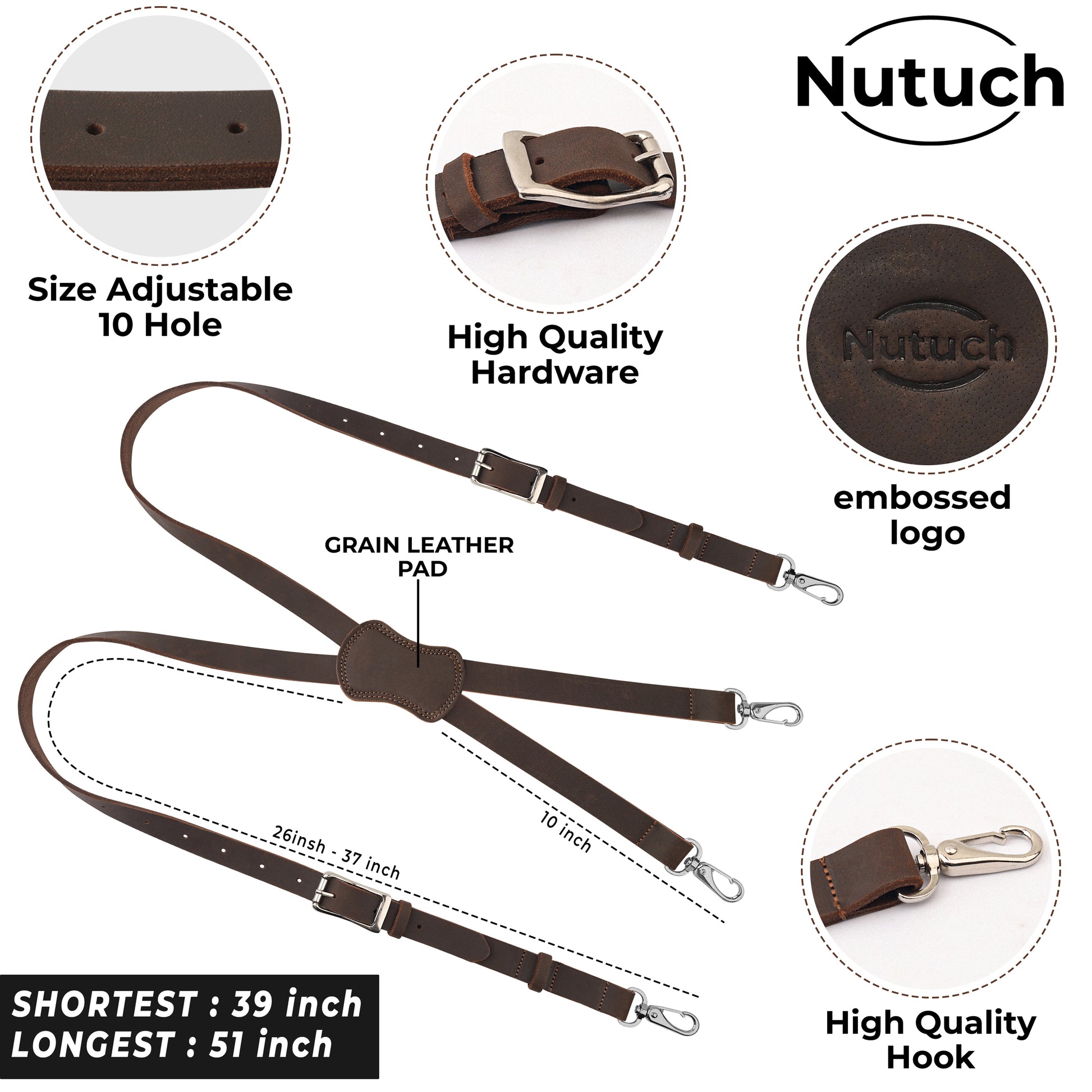GENUINE LEATHER SUSPENDER: NUTUCH Genuine Leather Suspender is a high-quality leather with its thick solid and durable material. Its crazy horse effect makes this suspender more unique and antique. The beautiful shade which maintains its natural feel, authentic character, soft and easy touch.