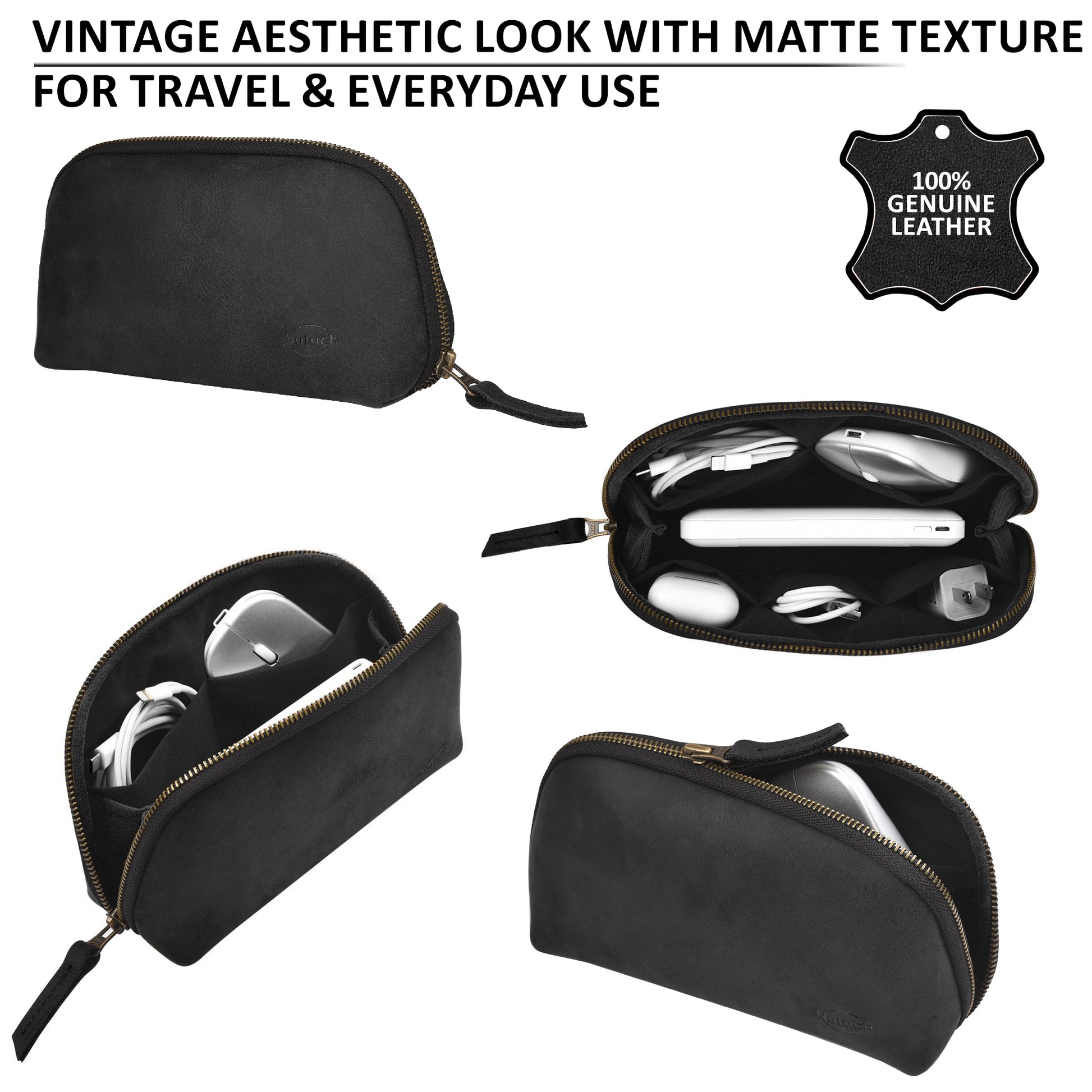 NUTUCH Black Leather Tech Pouch for Cables Chargers Phone | Tech Bag | Zipper Travel Accessory Pouch | Electric Organizer Case Travel Bag | Cord Cable Pouch | NT-701-T-BL