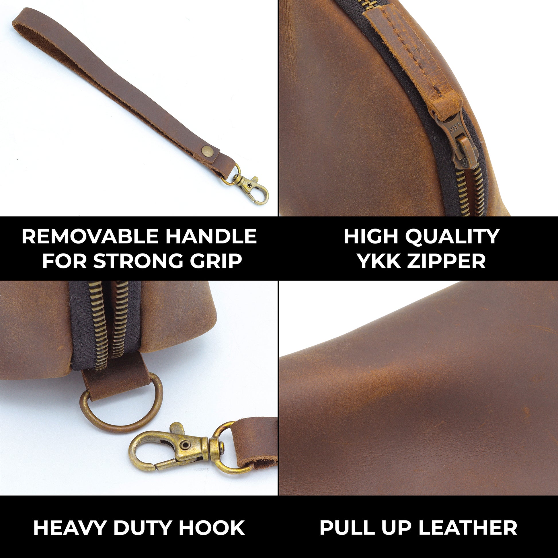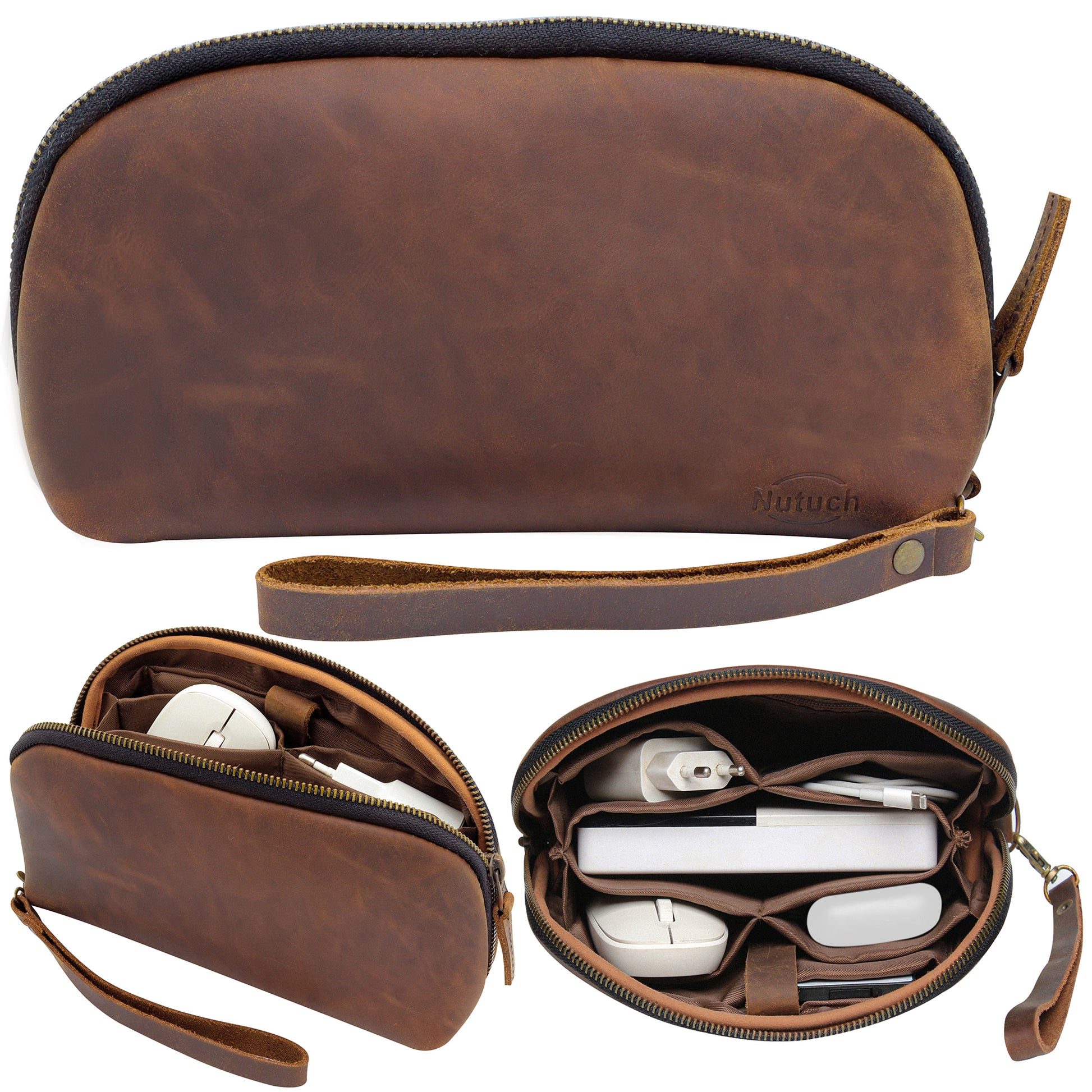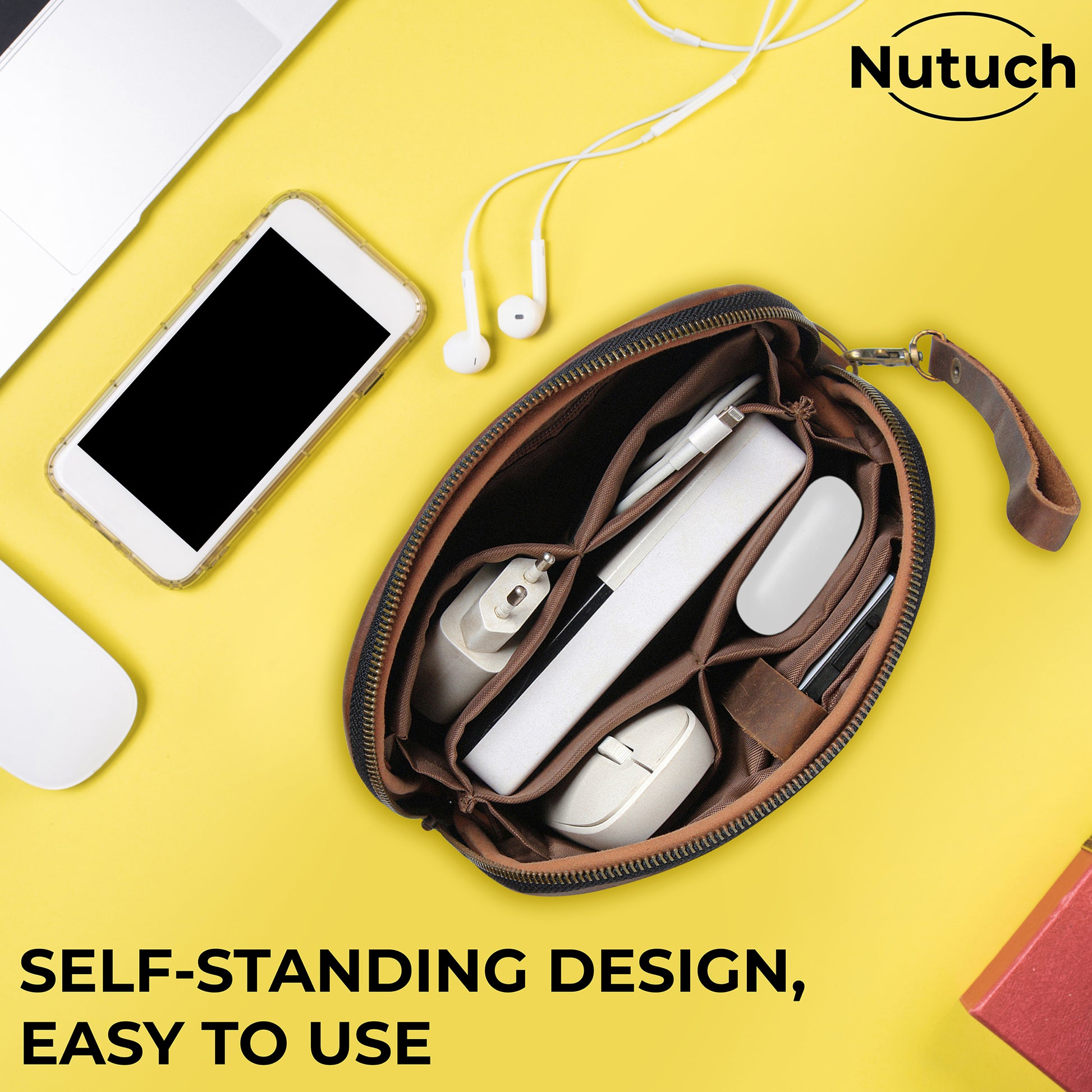 - The Nutuch Leather Tech Pouch is crafted from premium full-grain leather, offering exceptional durability, a soft feel, and a unique texture that ensures long-lasting elegance. Its two-tone design adds a touch of sophistication to this stylish tech organizer.