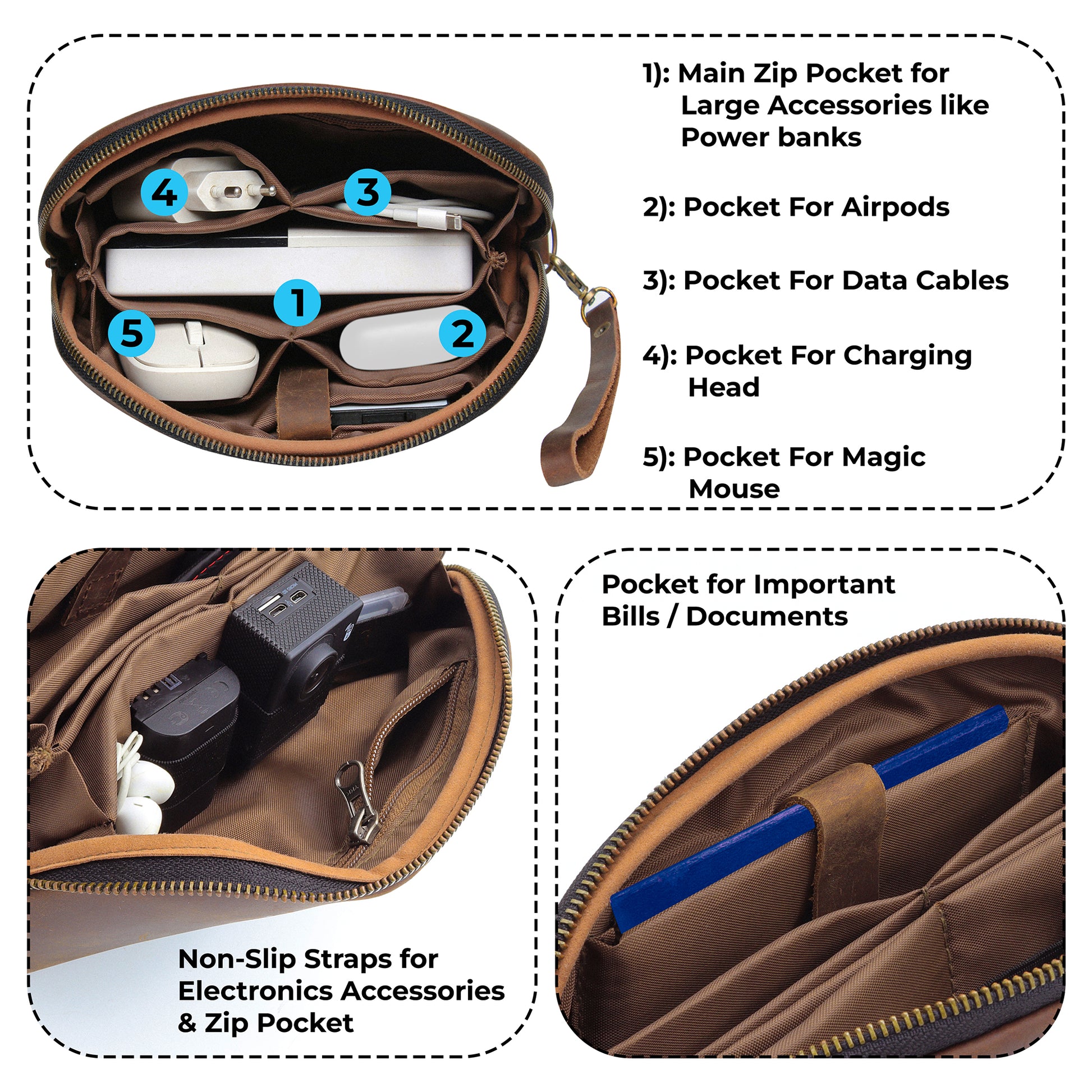NUTUCH Leather Tech Pouch for Cables Chargers Phone | Tech Bag | Zipper Travel Accessory Pouch | Electronic Organizer Accessory for MacBook Charger, Cables, Power Bank, Cords, Case Travel Bag | NT-703-T